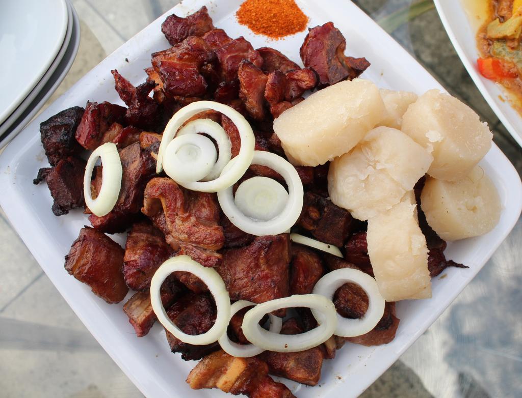 Goat grilled on the fire. This dish is flavored with ablend of BBQ spices and topped with fresh tomatoes and onions.